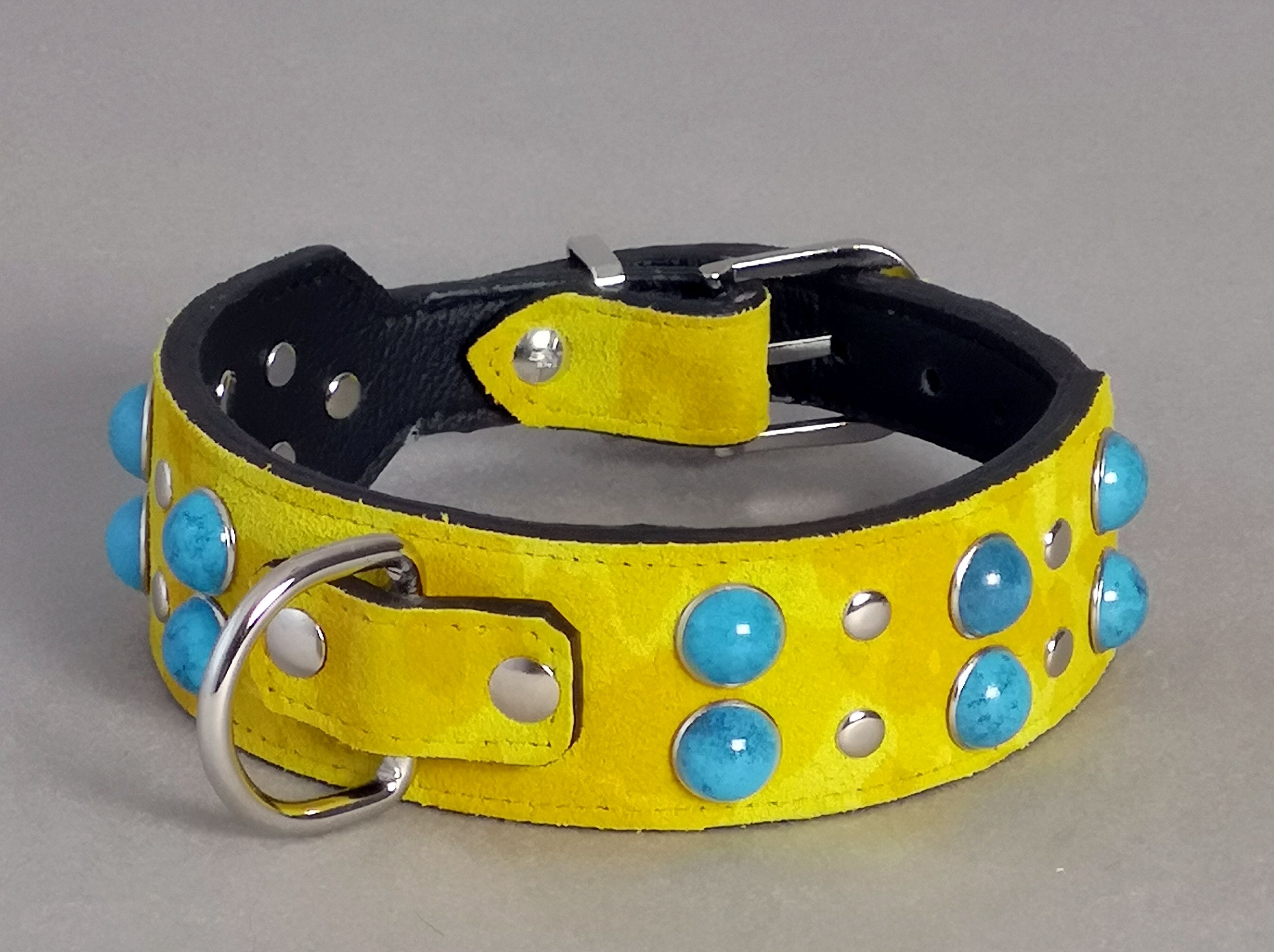 Rindsleder. Sonnengelb. Glattleder. Aus Italien. Innen schwarzes Rindsleder. Romantische Engel-Nieten. Türkis-Nieten aus Kunststoff und Metall. Schnallen und Ösen silberfarbig.  7 Löcher im Riemen.