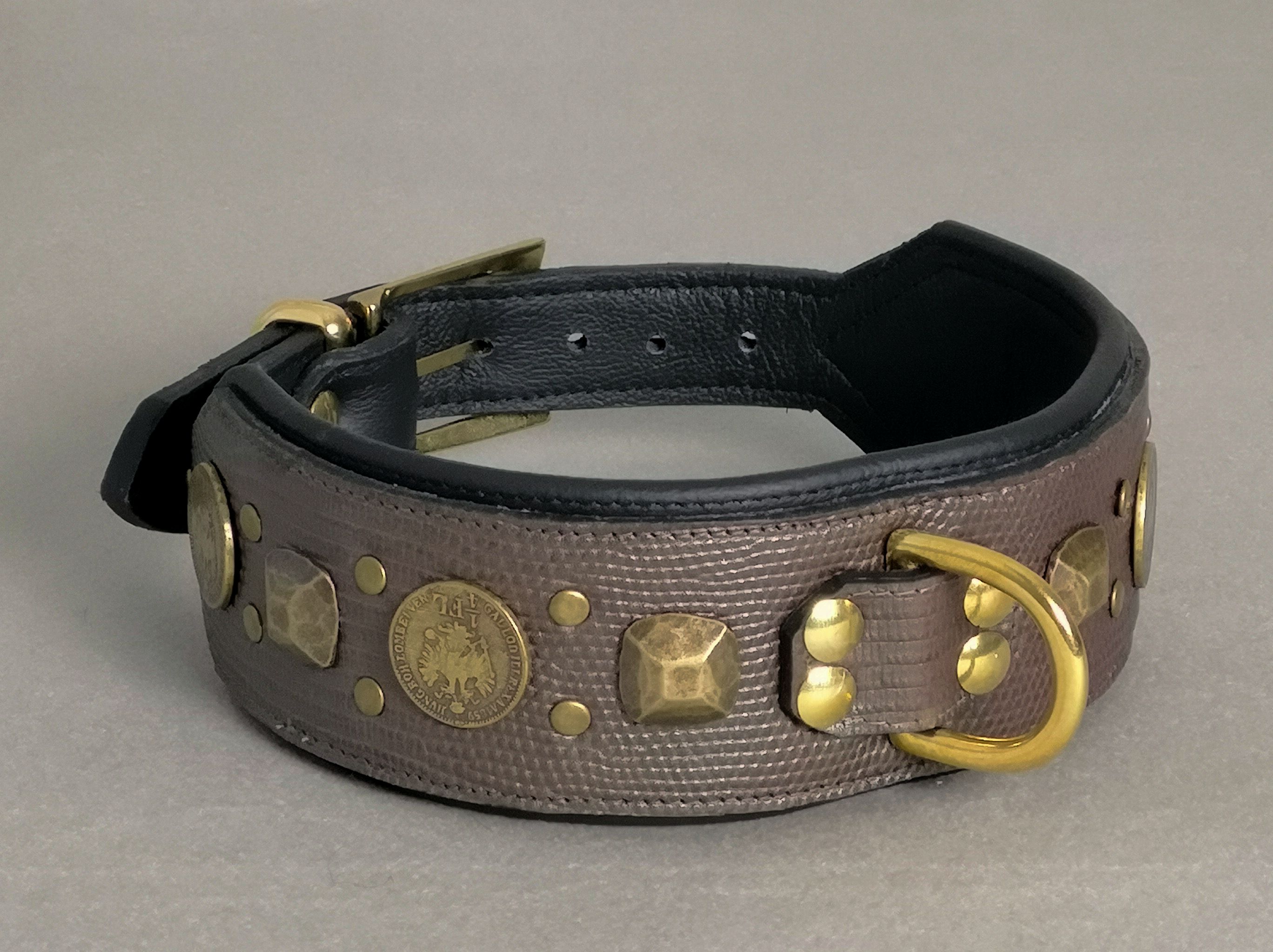Festes Rindsleder, Braun-Grün-Schimmer mit Echsen-Optik. Aus Italien. Innen schwarzes Rindsleder. Nieten messingfarben, Münzen u. a.. Schnallen und Ösen goldfarben. 8 Löcher im Riemen.