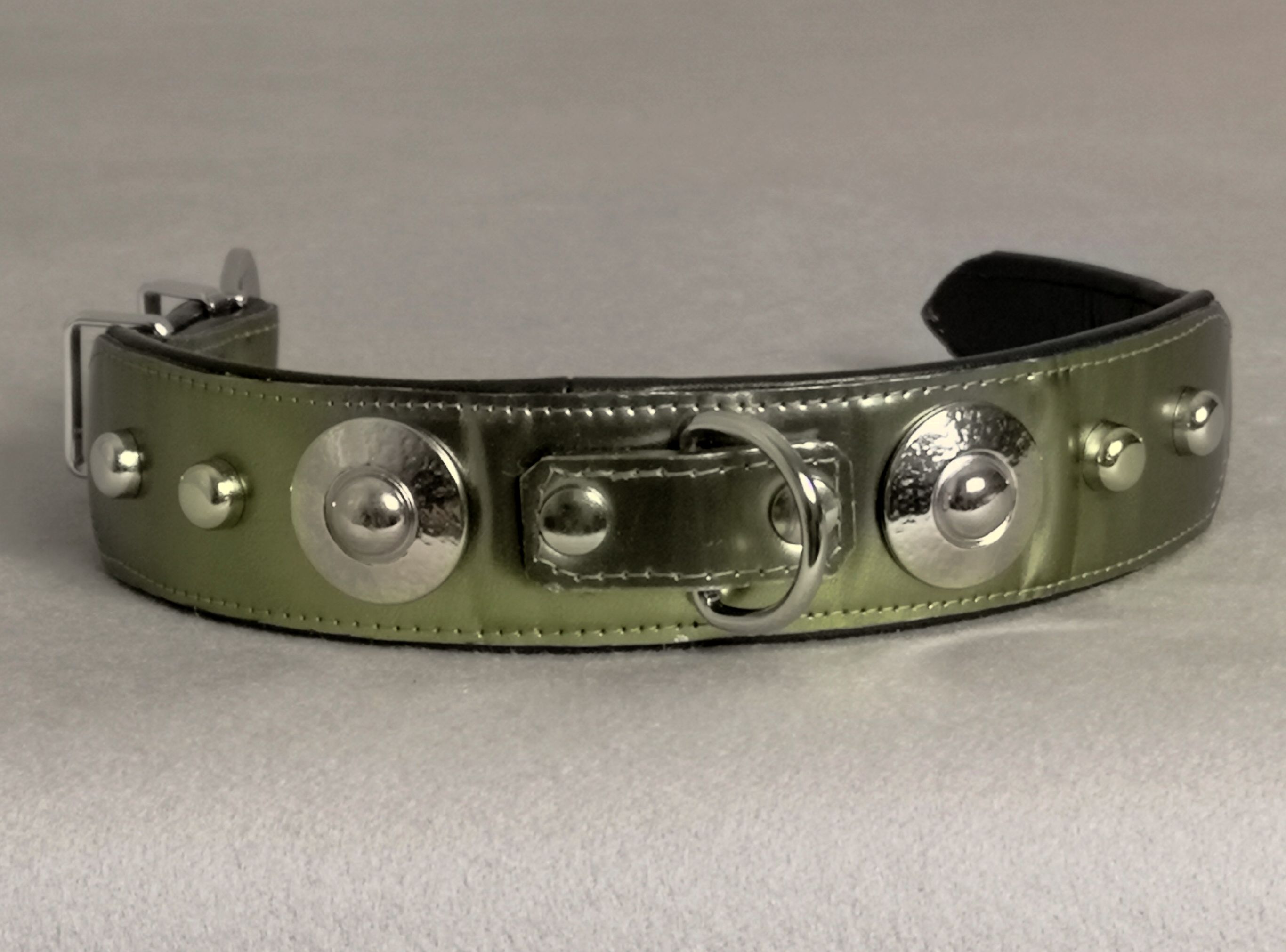 Feines Lammleder, Lindgrün-Metallic, mattiert. Aus Italien. Innen schwarzes Rindsleder. Coole gehämmerte und hochglänzende Rund-Nieten. Schnallen und Ösen silberfarbig. 3 Löcher im Riemen.