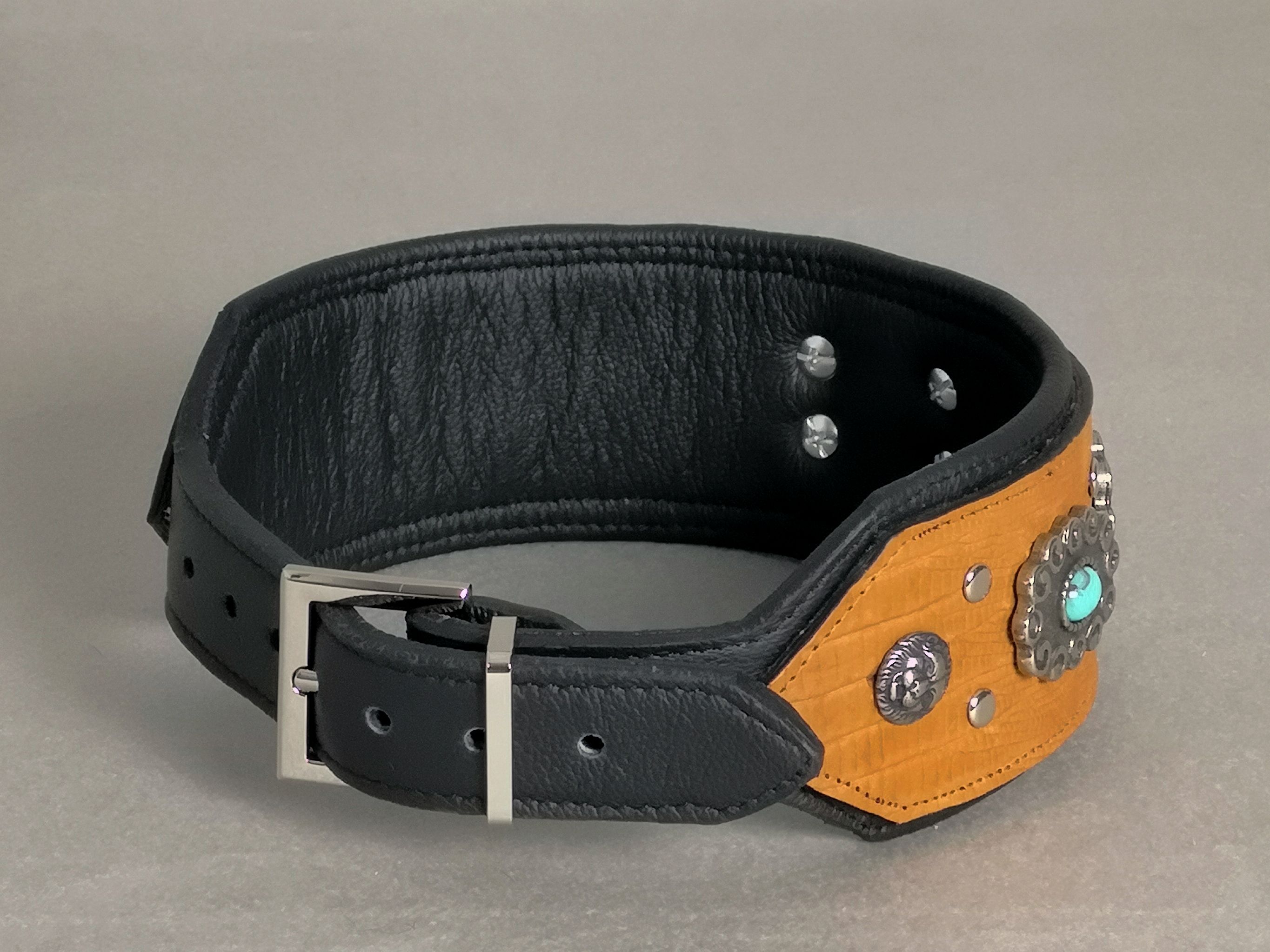 Festes Rindsleder. Caramelfarben mit Echsen-Optik. Aus Italien. Innen schwarzes Rindsleder. Nieten Altsilber mit Türkis-Steinen aus Kunststoff. Schnallen und Ösen silberfarben. 7 Löcher im Riemen.