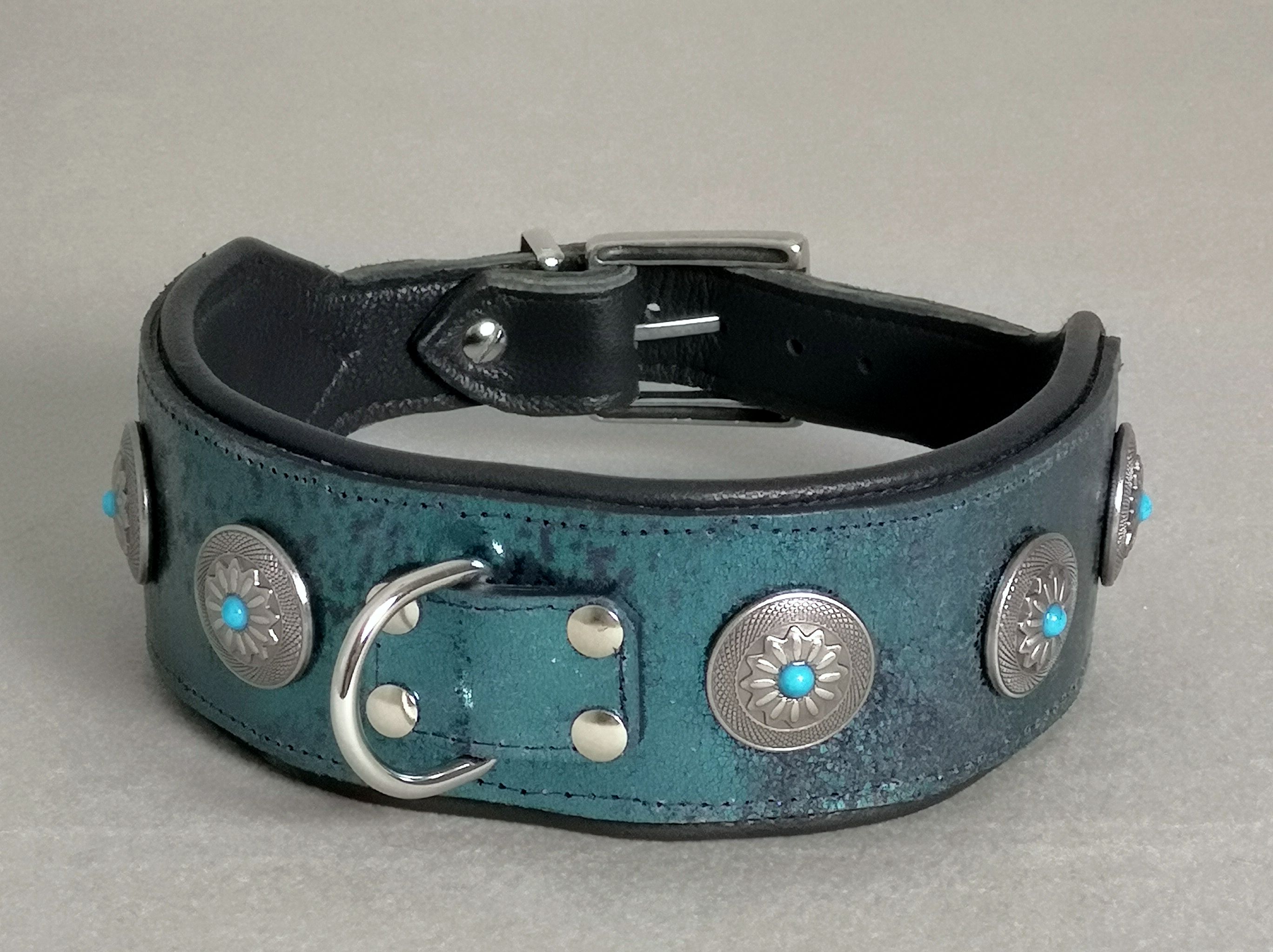 Hochwertiges Rindsleder. Glattleder mit intensiven Glamour-Effekt in Petrol. aus Italien. Innen schwarzes Rindsleder. Western-Nieten aus Metall und Türkis. Schnallen und Ösen silberfarbig. 7 Löcher im Riemen.