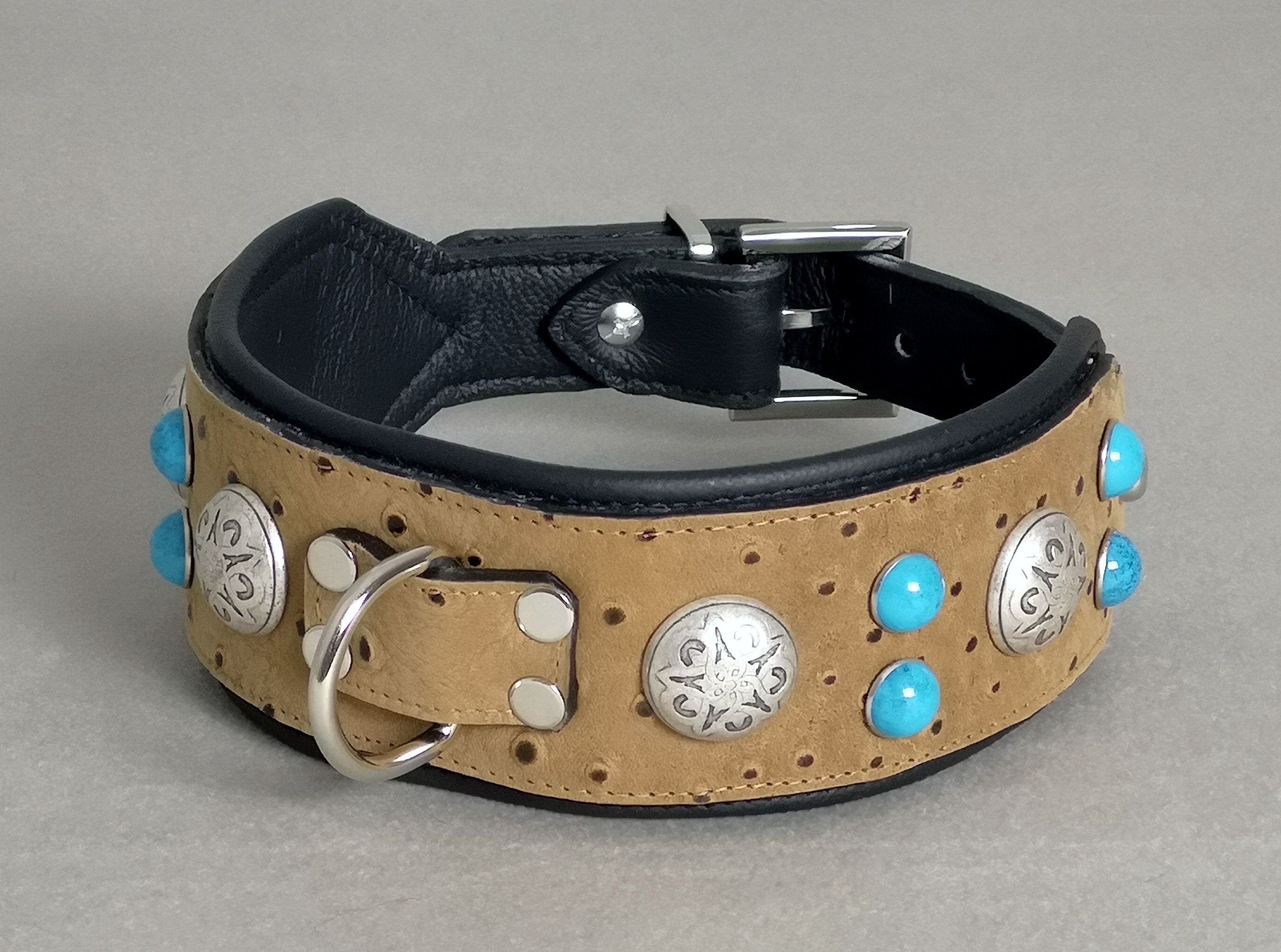 Hochwertiges Rindsleder. Nebelgrau mit Kroko-Prägung. Aus Italien. Innen schwarzes Rindsleder. Antique-Nieten mit  Türkis-Steinen aus Metall und Kunststoff. Schnallen und Ösen silberfarbig. 7 Löcher im Riemen.