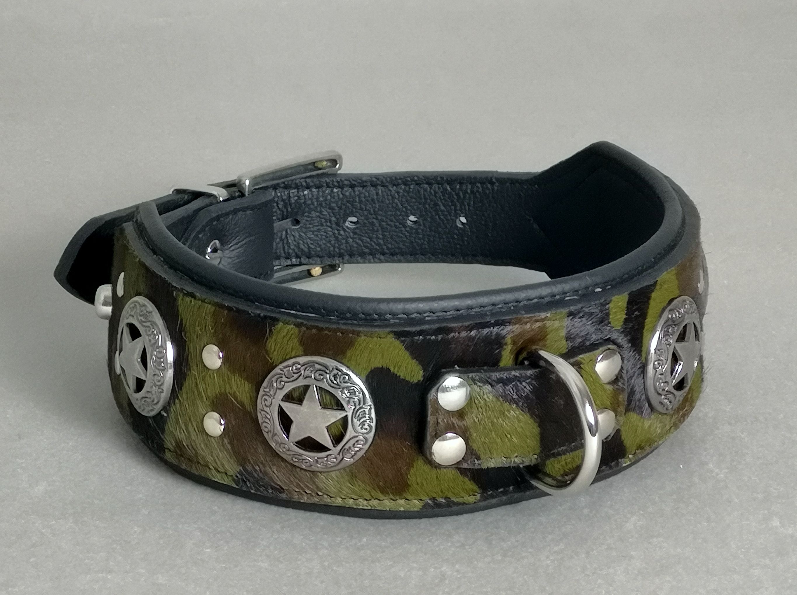Gefärbtes Kuhfell aus Deutschland. Oliv-Braun-Schwarz. Klassisches Camouflage-Design. Innen schwarzes Rindsleder. Military-Stern-Nieten in Altsilber. Schnallen und Ösen silberfarbig. 7 Löcher im Riemen.