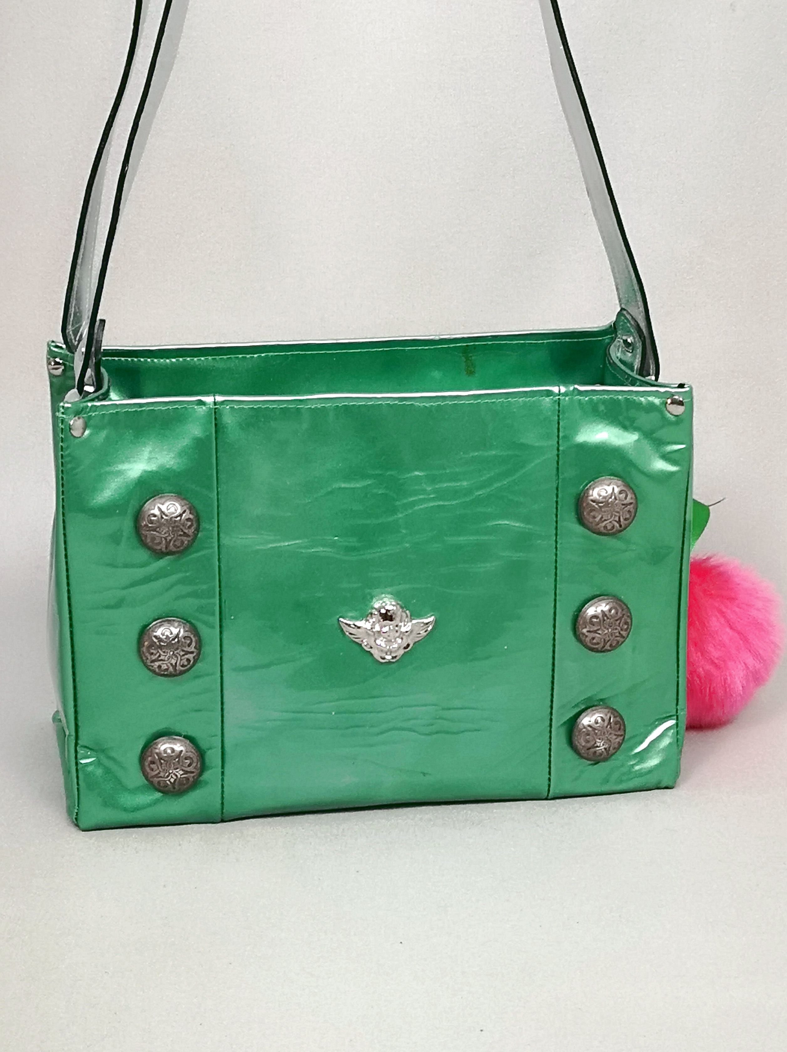 Der Metallic-Effekt im Lackleder macht die Tasche zu einem sehr ungewöhnlichen Eyecatcher. Auch die großen Nieten mit dem Muster, das Runen ähnelt, sind etwas ganz Besonderes.