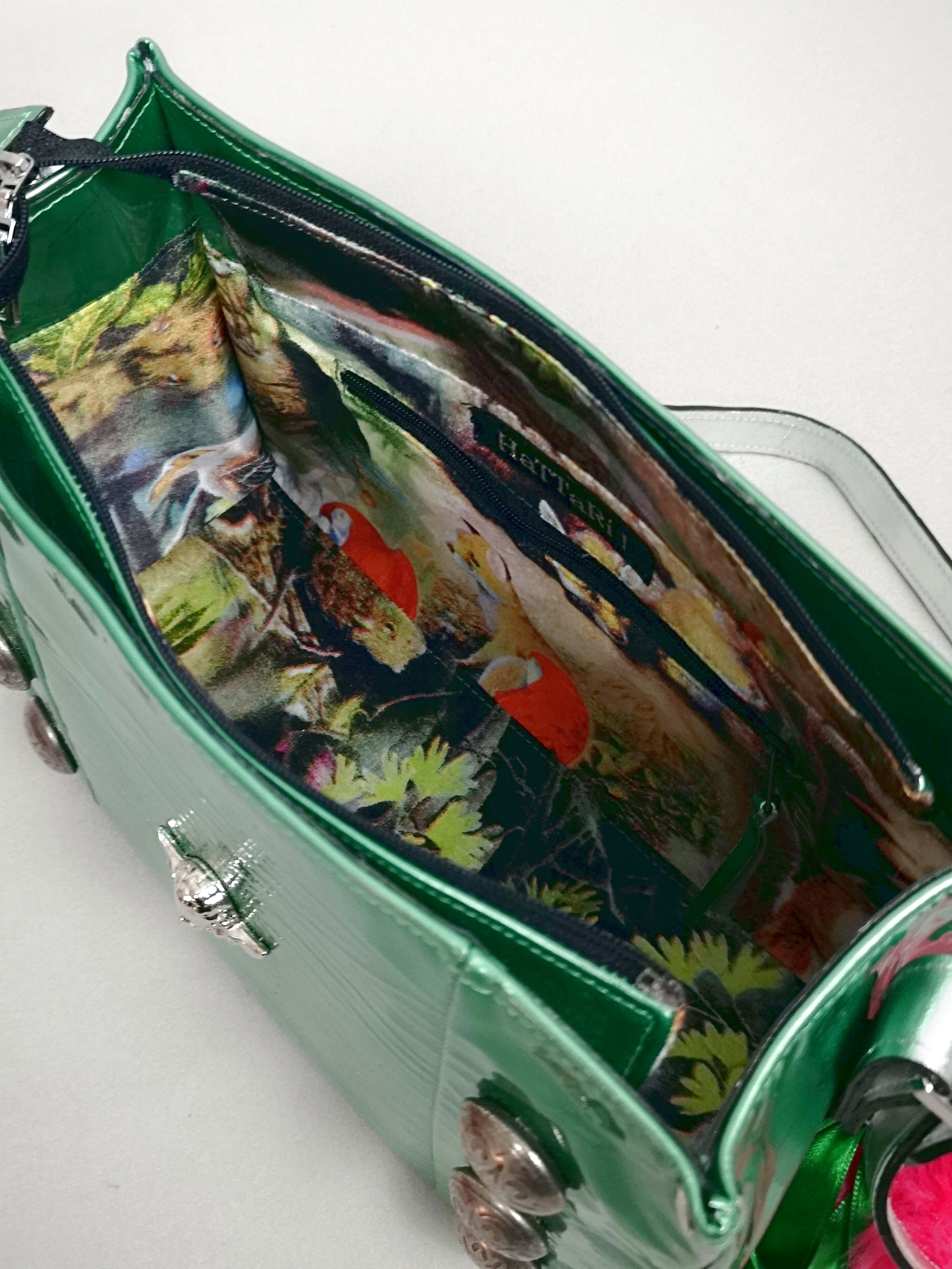 Leder: Grünes Metallic-Lackleder, Rindsleder, fest, leichte Used-Optik durch Farbverläufe, Italien