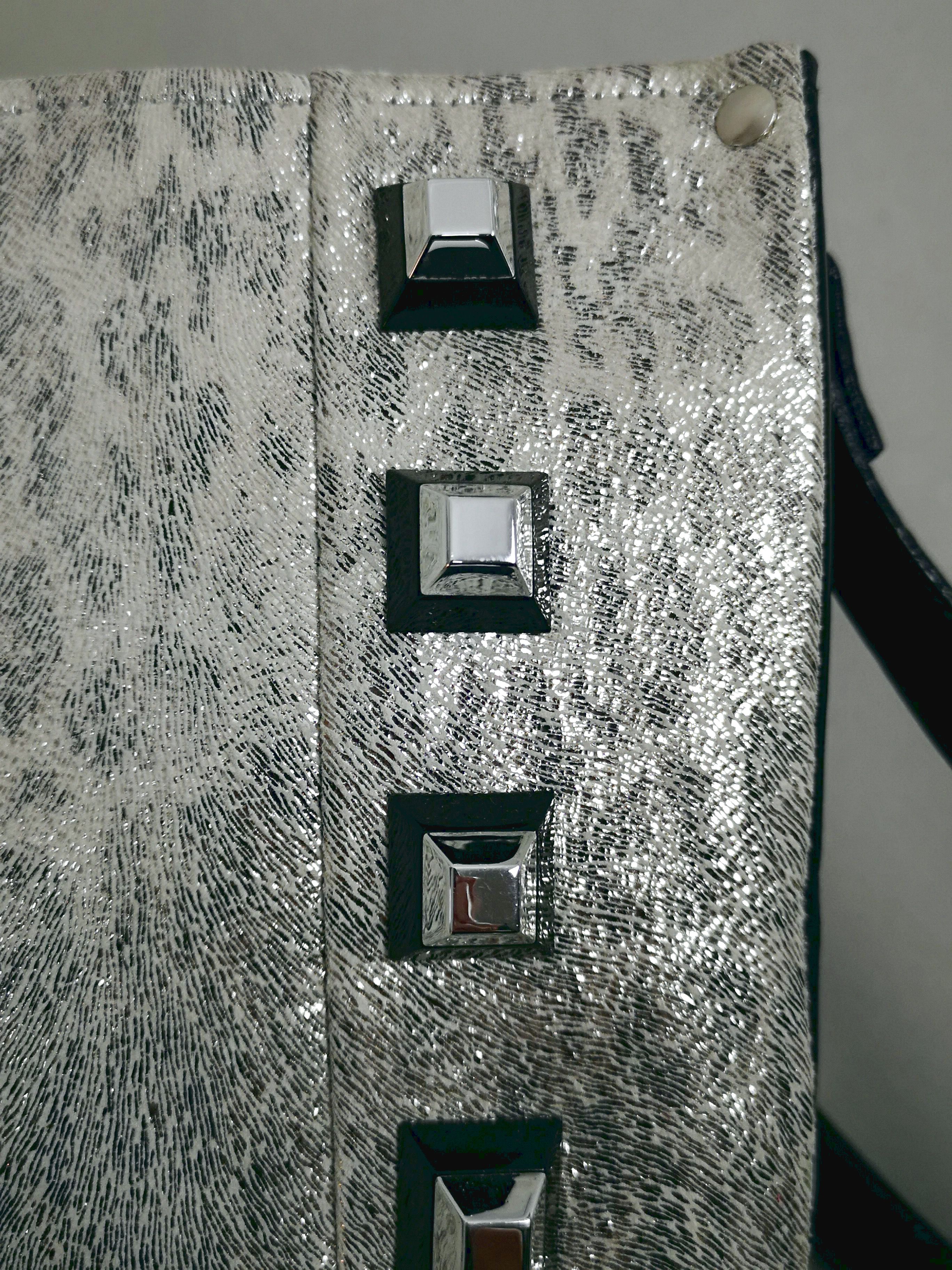 Applikation: Nieten auf der Tasche, alle Schnallen, Ösen und Nieten an den Riemen: Silberfarben