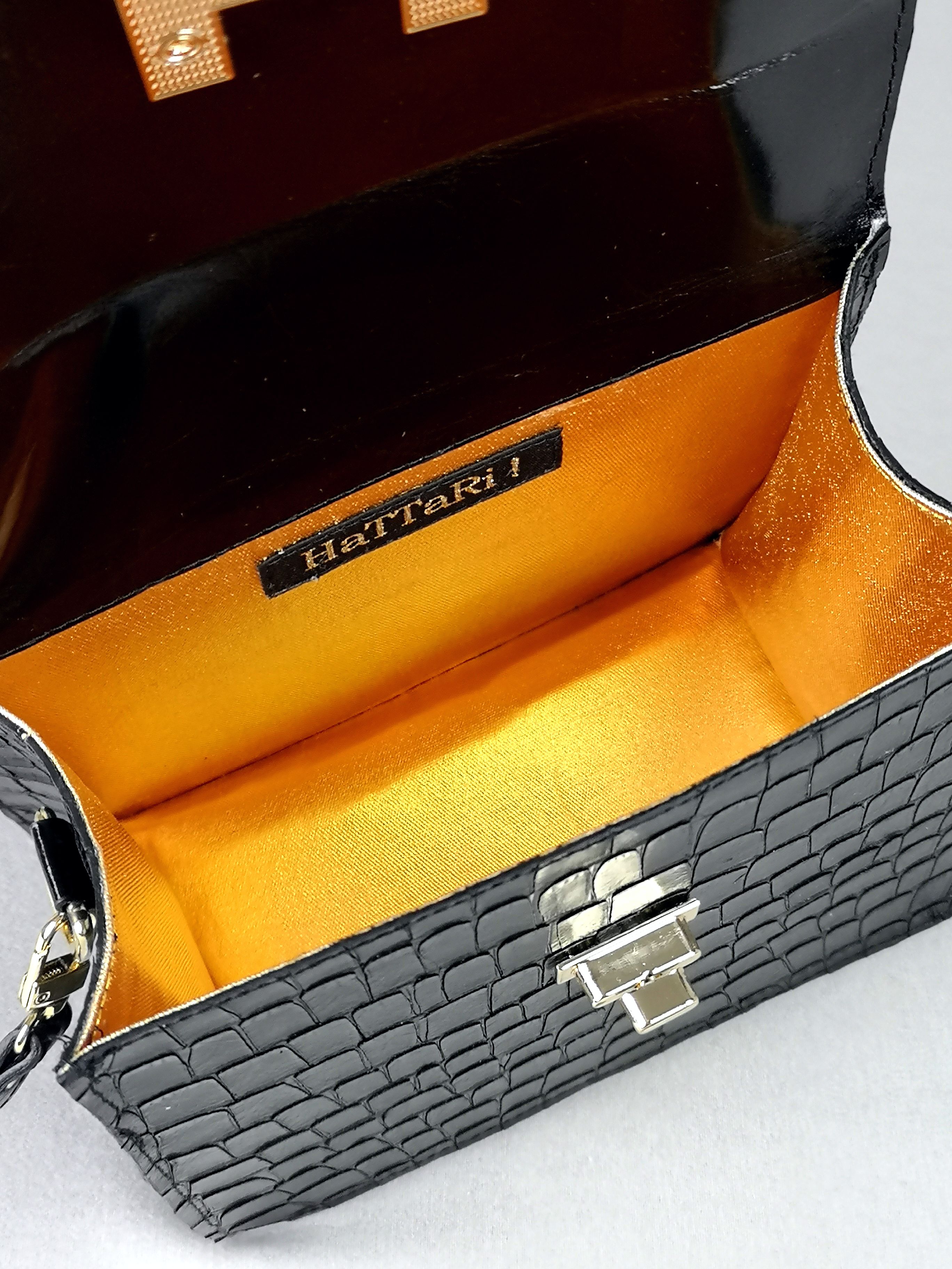 Innen hat die kleine Tasche ein geräumiges Fach und ist mit einem glänzenden, goldfarbenen Stoff gefüttert.