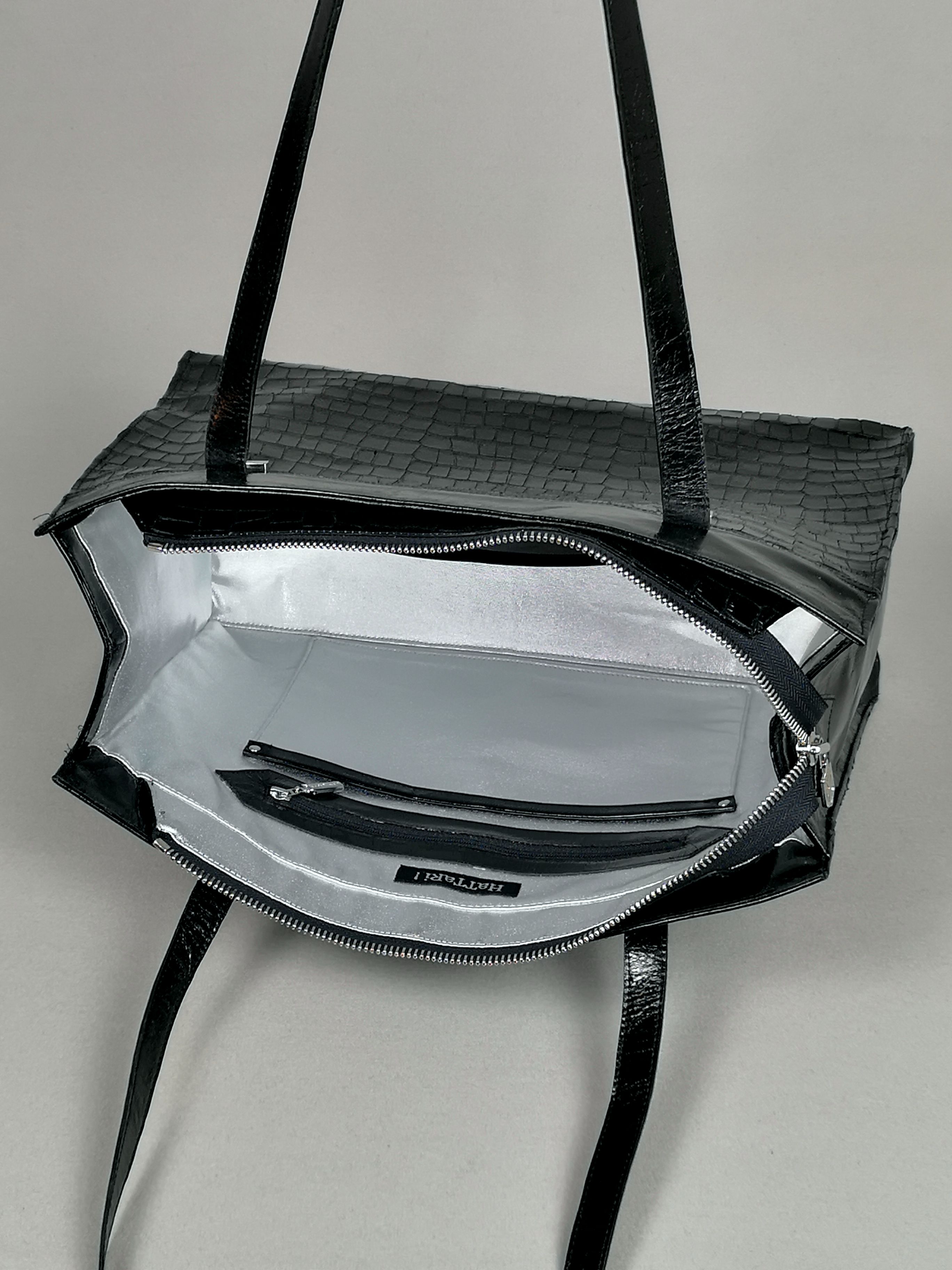 Edles Kalbsleder und Krokodil-Optik machen dieses Modell zur Upperclass der Handtaschen. Kleine silberne Endkappen an den Riemen verstärken die Eleganz. Das Silberfutter verleiht der Tasche einen Touch von Glamour.
